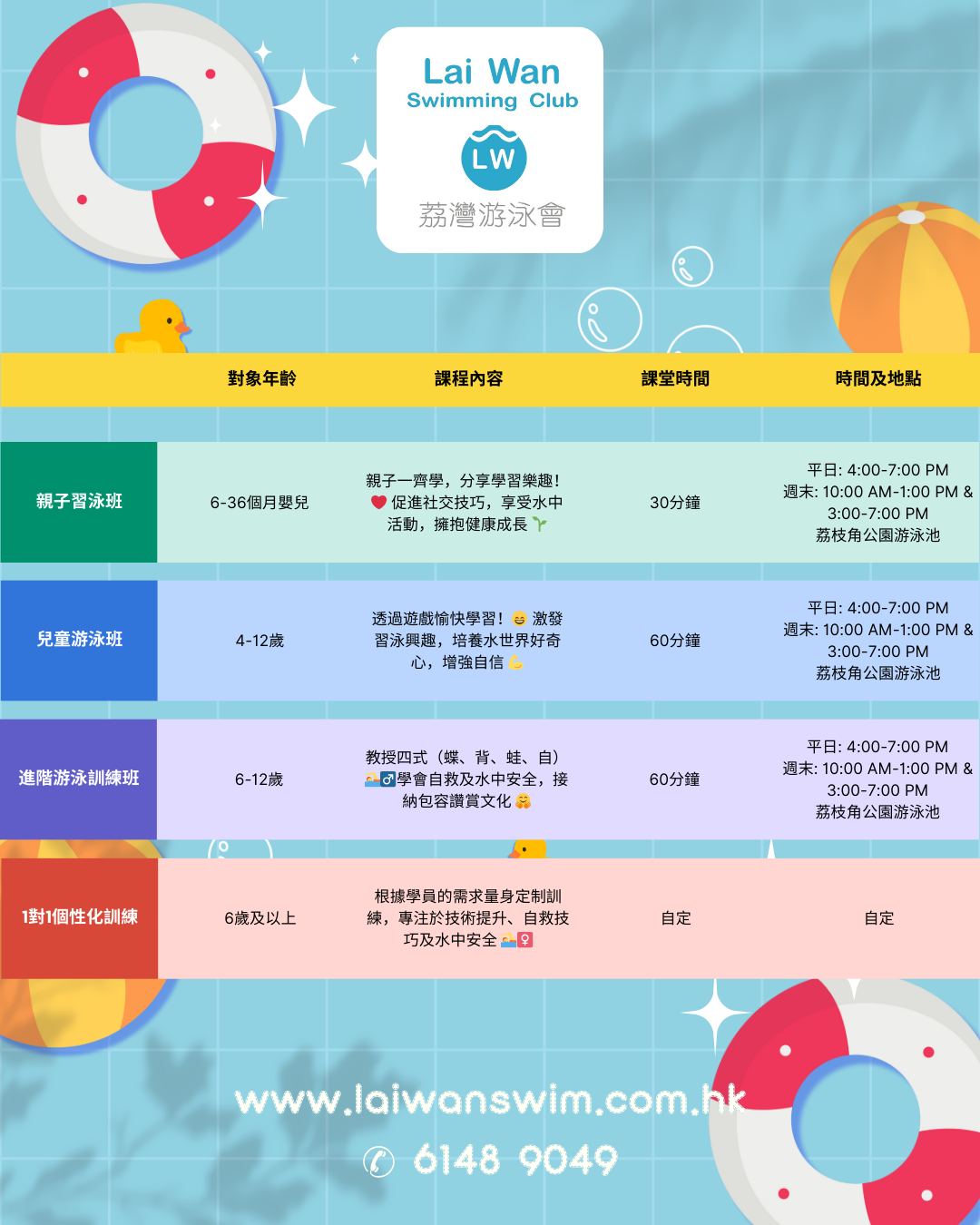 ‧ Guarantee 10 hours learn and able to swim 20 meters.